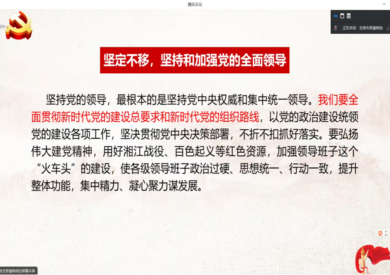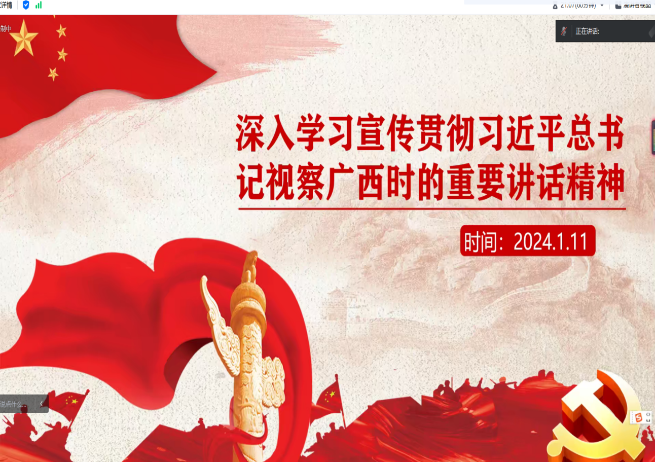 为深入学习宣传贯彻习近平总书记视察广西时的重要讲话精神,william威廉亚洲生物专业员工党支部于1月11日19:30以线上会议的形式开展了“深入学习宣传贯彻习近平总书记视察广西时的重要讲话精神”主题党课培训。本次会议参会人员为生物专业员工党支部全体党员,此次培训课程由党支部副书记潘艳桃主持。