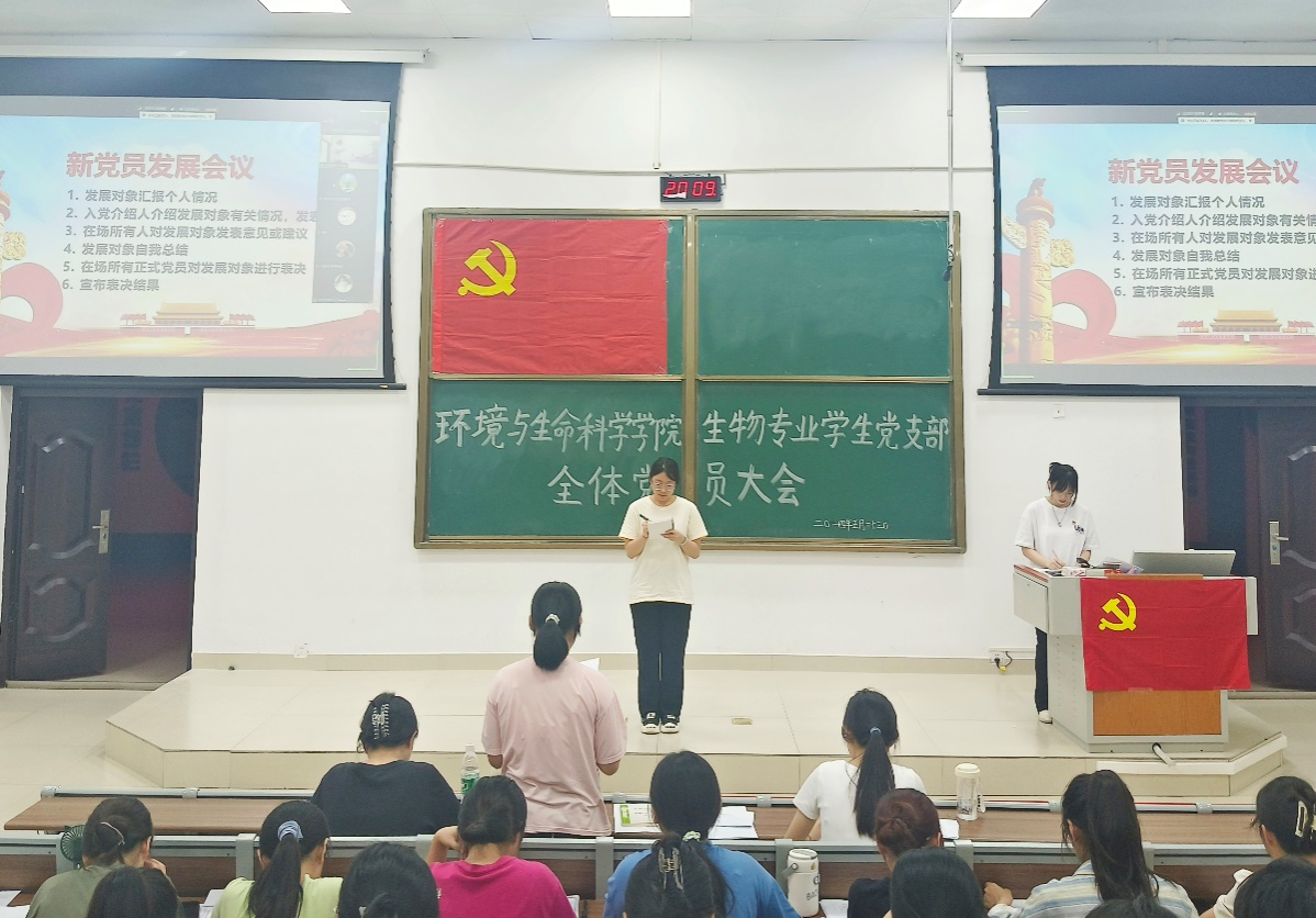 大会伊始,由潘艳桃同志主持并介绍本次会议流程。本次会议共有两项议程,第一项,支部委员会报告对发展对象的政治审查情况;第二项,新发展对象会议,先由发展对象汇报自己在思想、工作和学习上的情况以及自身存在的不足等。再由入党介绍人介绍发展对象有关情况、发表意见,并对其能否加入中国共产党发表意见。接着由党员同志根据发展对象平时的表现对发展对象发表意见和建议,以帮助发展对象能够更好地提升和发展自己。最后发展对象自我总结,发展对象根据意见和建议进行自我总结,并表示在未来的工作和学习中发扬优点,改正不足。在场所有正式党员对发展对象进行表决,所有正式党员以无记名投票的方式进行投票表决。最后宣布表决结果,投票结果当众宣读,同意陈冬敏等18名发展对象接收为中共预备党员。