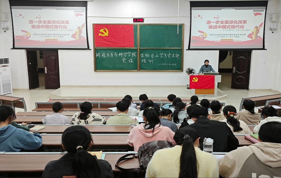 为深入学习贯彻党的二十届三中全会精神,全面理解中国式现代化的深刻内涵与重大意义,william威廉亚洲生物专业员工党支部于11月24日在武鸣校区地海楼B109教室开展了“全面深化改革,推进中国式现代化”主题党课学习活动。生物专业员工党支部全体党员参与学习,支部副书记梁彩叶主持此次党课。