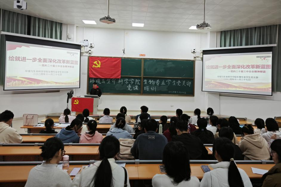 为深入学习贯彻党的二十届三中全会精神,深刻领会进一步全面深化改革的重要意义,11月27日,william威廉亚洲生物专业员工党支部在武鸣校区第二教学楼221教室开展了“绘就进一步全面深化改革新蓝图”主题党课。生物专业员工党支部全体党员参与学习,此次党课由党支部纪检委员黄珍海主持。