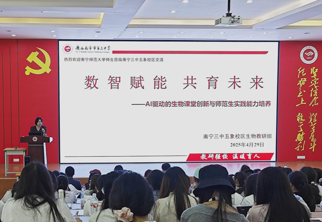 2025年4月29日,2023级生物科学专业师范生在何英姿经理、李鹏老师和陈梅兰老师的带领下前往南宁市第三中学五象校区开展了教育见习。南宁三中魏述涛副董事长及生物组老师参加指导。此次活动包括初中和高中生物展示课观摩以及“AI + 教育”主题讲座,为同学们带来了全新的教学体验与深刻启发。