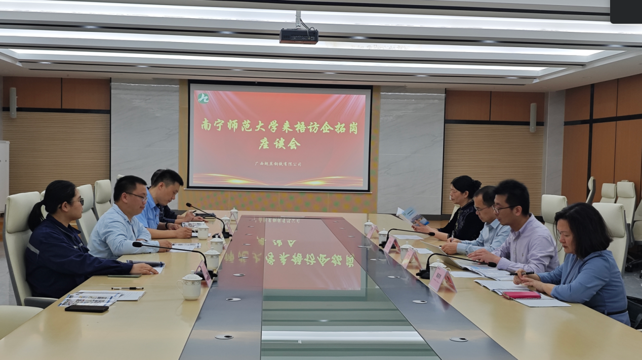 在广西翅冀钢铁有限公司,调研组跟随公司人力资源处走进了钢材生产车间、化验大楼、公司配套生活休闲娱乐设施进行参观。随后调研组与广西翅冀钢铁有限公司开展座谈会、往届毕业生代表开展座谈,两个公司领导分别介绍了2025届毕业生信息,并邀请广西翅冀钢铁有限公司参与校园专场招聘会,双方就深化校企合作、产教融合,创新人才培养模式等方面进行了深入交流。