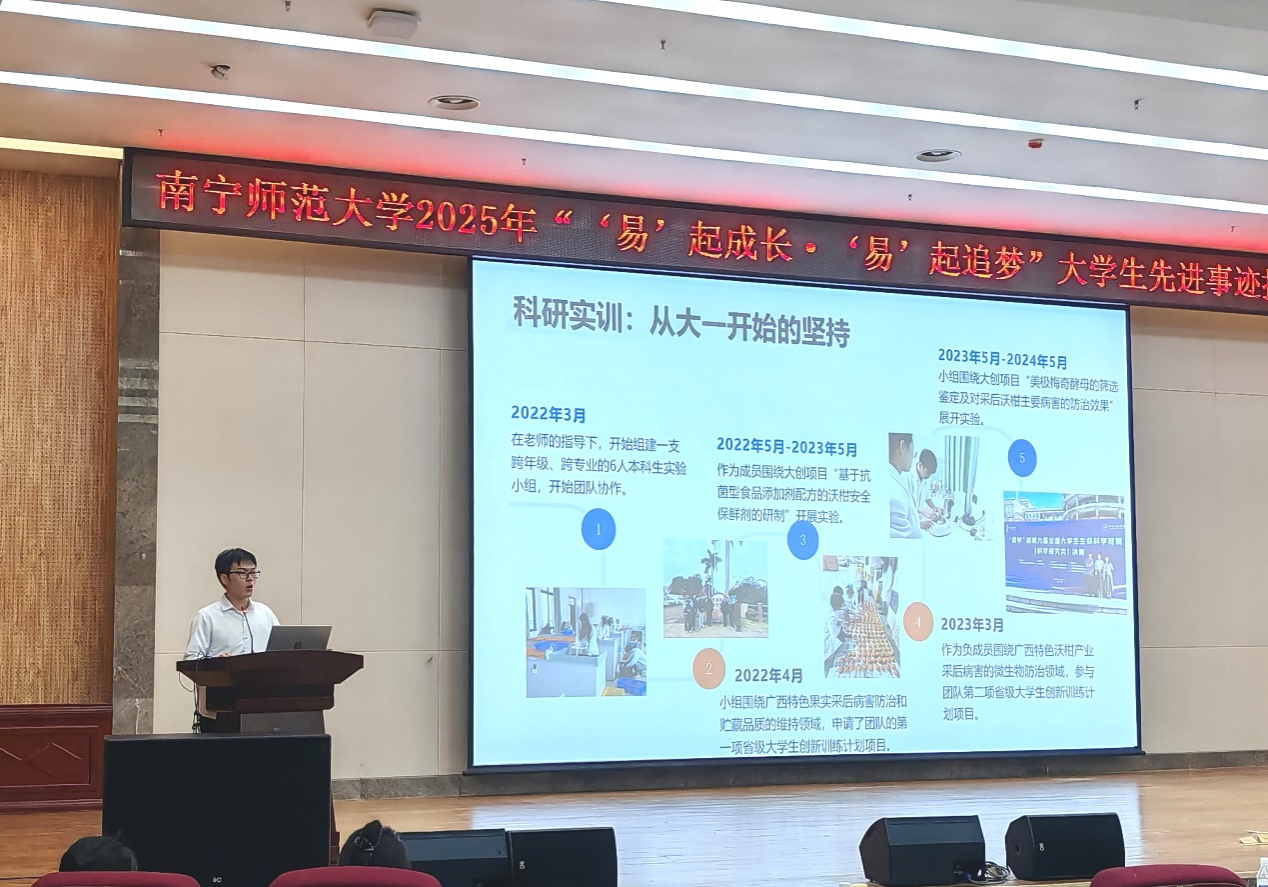 5月23日下午,2021级生物科学2班员工代表蒋琳华在武鸣校区图书馆报告厅参加“‘易’起成长,‘易’起追梦”老员工先进事迹报告会,并作主题分享。