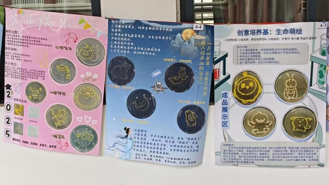 展览现场中的每一幅作品都令人驻足惊叹。同学们将从环境中分离纯化的球菌、杆菌以及酵母菌等微生物,依据其独特的颜色与生长特性,巧妙设计成生动的图案并绘制在培养皿上。例如,“节气菌语”队用金黄色葡萄球菌和白色念球菌描绘绽放的虞美人、玉兰花、栀子花和木芙蓉;“卡通小兮”队以卡通人物图案创作培养皿,将卡通角色的个性、故事与创新理念深度结合;还有“嫦月新程”队以菌为墨,于方寸培养皿间,重现“嫦娥奔月”的千年浪漫等。