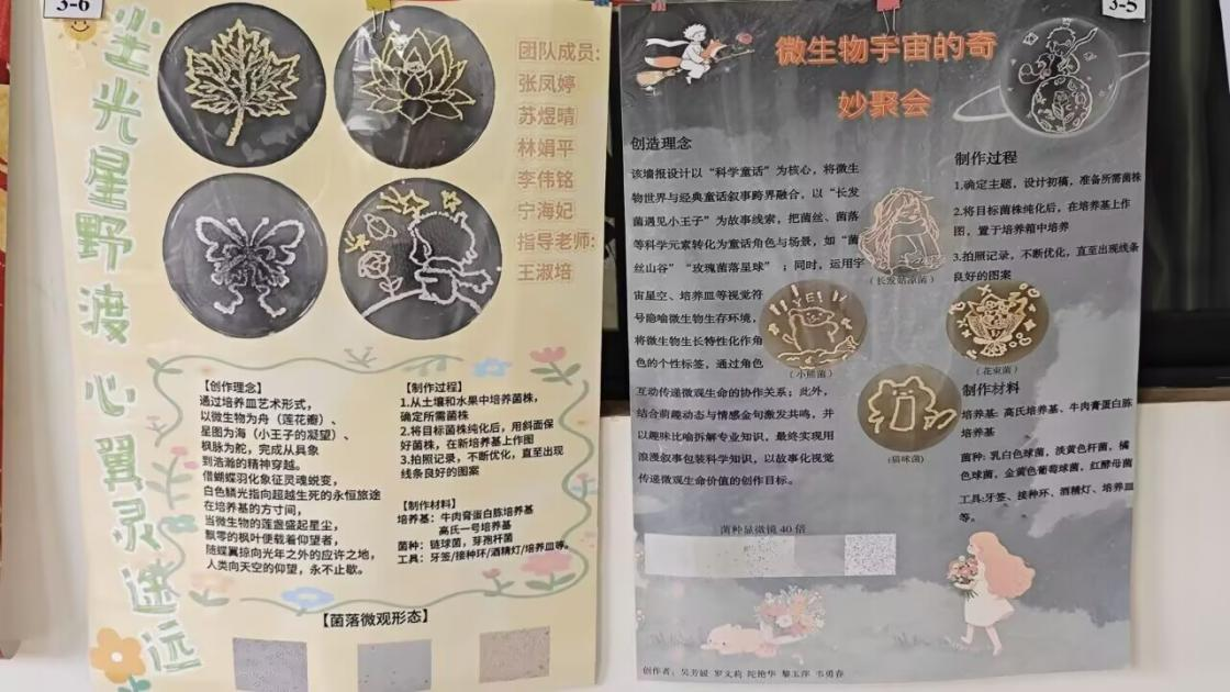这些栩栩如生的作品让参观者深刻感受到了微观生命绽放的独特魅力。此次作品展突破传统实验框架,将家国情怀、课程思政与专业知识有机融合,让专业知识转化为可视化艺术表达,充分展现了生物学子的专业素养和创新潜力,进一步激发了同学们对微生物学科的探索热情,为跨学科实践教学提供了新范本。