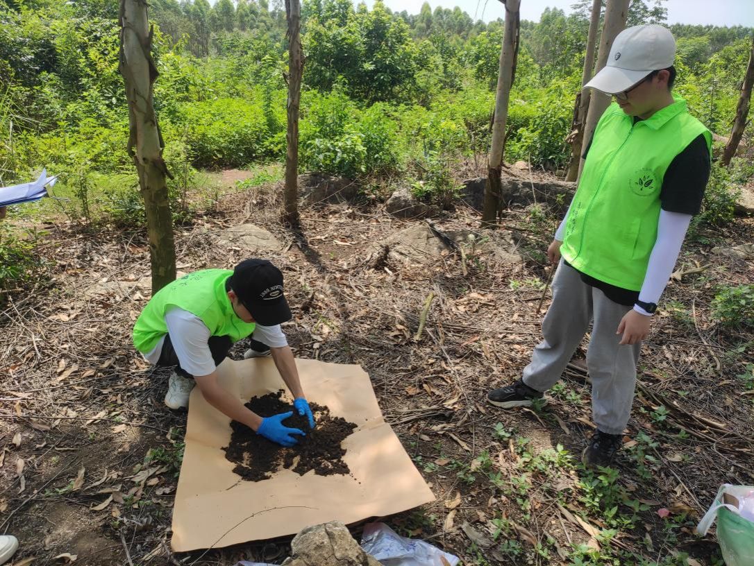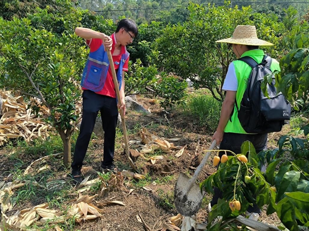 在驻村第一书记林少歆的引领下,实践团成员们顶着盛夏的烈日,穿梭在六联村的农田与果园中。尽管地表温度居高不下,大家依旧干劲十足。团队依据前期通过卫星遥感地图划分的地块类型,在耕地、园地、林地等不同区域精准确定等不同区域精准布设采样点。每到一处,志愿者们都严格按照规范进行操作:先清除表层落叶与杂草,再采集土壤样本,装入贴有编号的密封袋中。采样过程中,志愿者们说:“不同地块的土壤颜色、质地差异明显,农作物茁壮成长的密码可能就藏在里面。”这些带着泥土温度的样本,将被送往实验室进行包括pH值、有机质含量、重金属元素等多项指标的检测,为后续制定土壤肥力评估报告和绿色种植方案提供重要的数据支持。