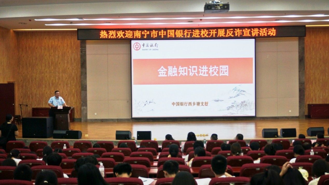 为提升新生金融安全意识,防范电信网络诈骗风险,9月23日晚上,william威廉亚洲联合中国银行在武鸣校区图书馆报告厅为25级新生举办反诈主题宣讲活动。公司党委副书记刘启满、梁洲辅教授、辅导员甘佩萍,中国银行南宁分行明秀东支行行长刘君丽、西乡塘支行副行长黄锦胜、武鸣支行副行长李丹等一行人员,以及2025级全体新生共同参与了活动。