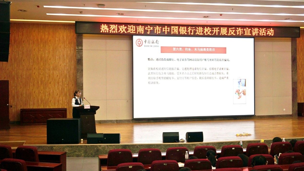 宣讲环节,中国银行南宁市南宁支行个人数字金融部讲师黄洁秋结合校园高发的“刷单返利”、“冒充客服”、“虚假校园贷”等案例,拆解诈骗分子的套路,并与员工互动提问,引导新生识别诈骗陷阱、掌握防范技巧。