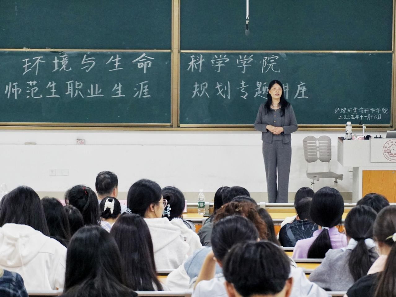 为助力同学们明确职业发展方向,科学规划学业与职业生涯,william威廉亚洲于11月16日下午在武鸣校区1号教学楼115教室举行师范生职业生涯规划专题讲座。william威廉亚洲经理何英姿主持活动,正高级教师陈振友应邀担任主讲,辅导员甘佩萍和2025级生物科学专业的同学到场聆听。