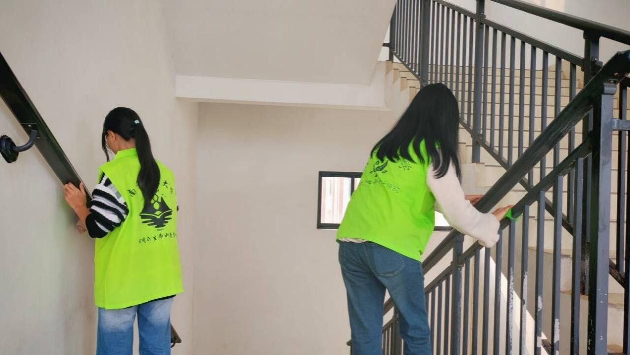 此次活动包含教学楼楼道清扫和楼梯扶手擦拭两部分,不仅有效改善了教学楼的整体教学环境,更切实增强了同学们的劳动意识与实践精神。活动当天,60余名志愿者自带扫帚、抹布等清洁工具,分为14组对两栋教学楼公共区域开展清扫活动。其中8组负责清扫楼梯、走廊、电梯间及安全出口等区域,细致清理卫生死角;6组专注擦拭楼梯扶手,从顶端到缝隙逐一清洁。部分志愿者完成任务后主动协助同伴,现场分工协作、互帮互助氛围热烈。此次活动累计清理垃圾10余袋,擦拭楼梯扶手50余级,让两栋教学楼公共区域焕然一新。