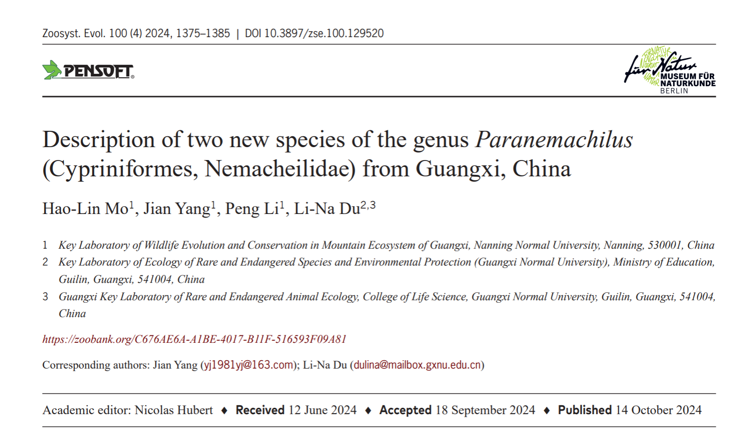 10月14日,2021级生物科学专业本科生莫昊霖同学以第一作者的身份在国际动物分类学期刊《Zoosystematics and Evolution》(SCI收录,影响因子1.6,JCRQ2,中科院二区)上发表了题目为《Description of two new species of the genusParanemachilus(Cypriniformes: Nemacheilidae) from Guangxi, China》的研究论文(doi: 10.3897/zse.100.129520.)。该论文是在该院杨剑研究员和广西师范老员工命科学公司杜丽娜副教授共同指导下完成的。这是继该院本科生钟佳宏同学以第一作者身份于2024年9月发表SCI论文以来的第2篇以本科生作为第一作者在同一SCI期刊发表的学术论文。