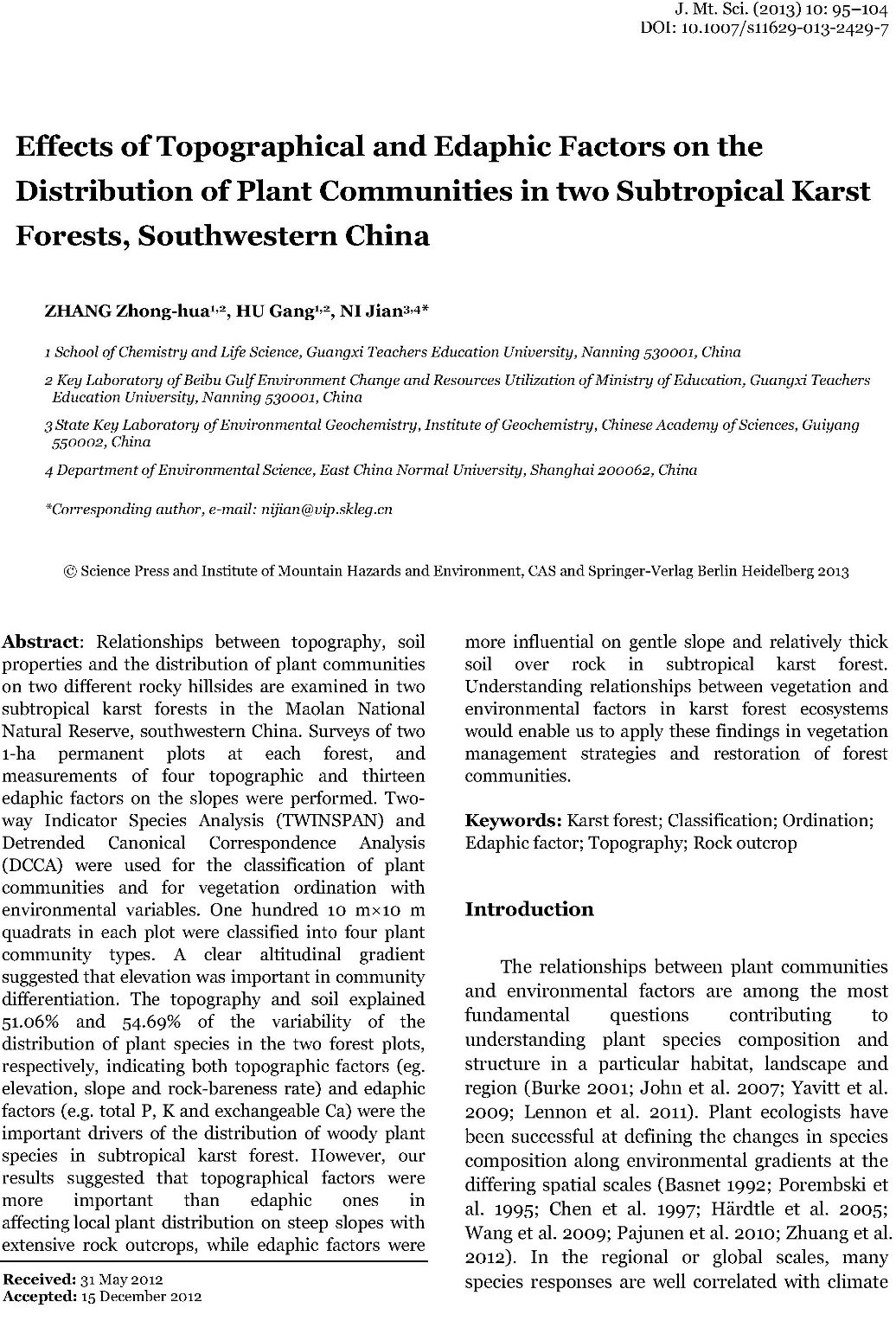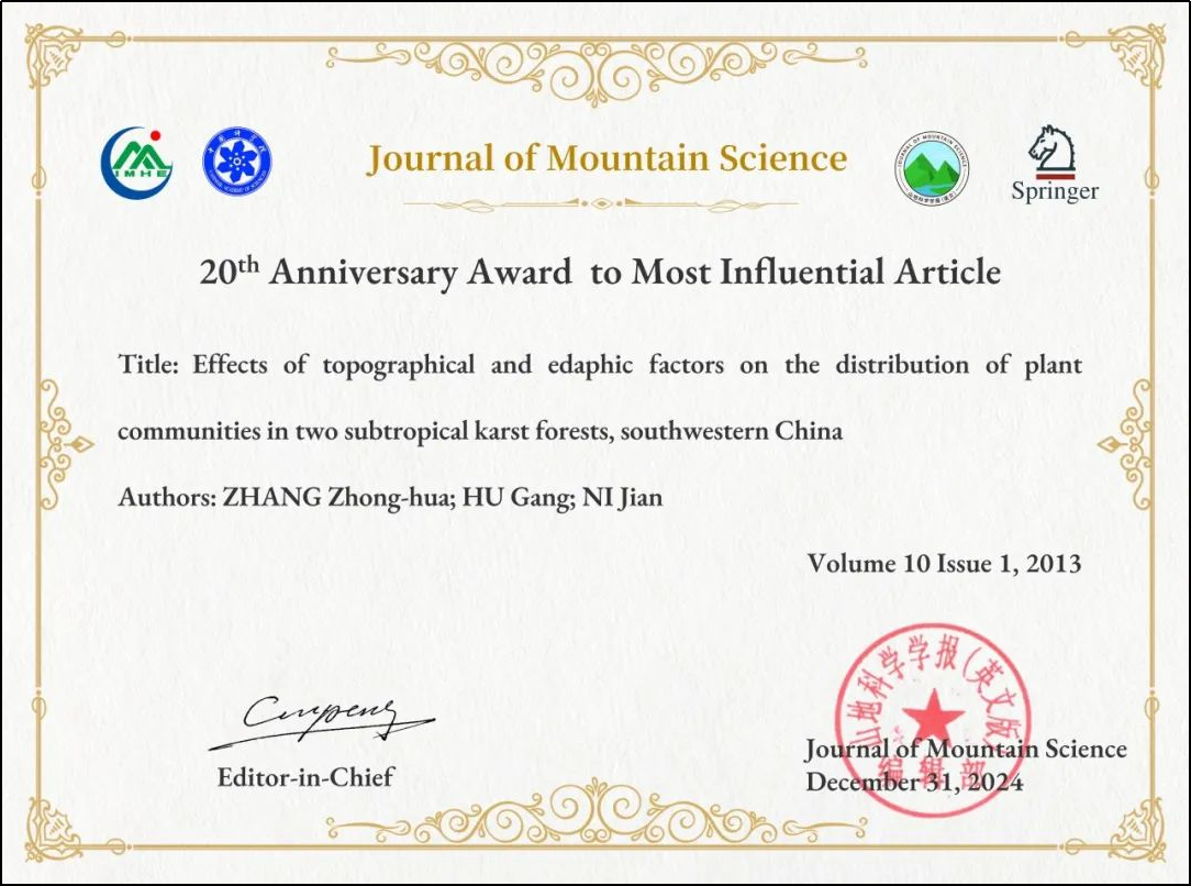 在Journal of Mountain Science创刊20周年之际,期刊从总被引频次、下载量、国际影响力、内容质量等方面综合考虑,在创刊以来发表的近3000篇文章中遴选了50篇最有影响力的论文。公司张忠华教授发表的论文(Zhang ZH, Hu G, Ni J. Effects of topographical and edaphic factors on the distribution of plant communities in two subtropical karst forests, southwestern China. Journal of Mountain Science, 2013, 10(1): 95-104.)荣获该期刊创刊20周年最具影响力论文荣誉称号。william威廉亚洲(原广西师范公司)为论文第一完成单位。
