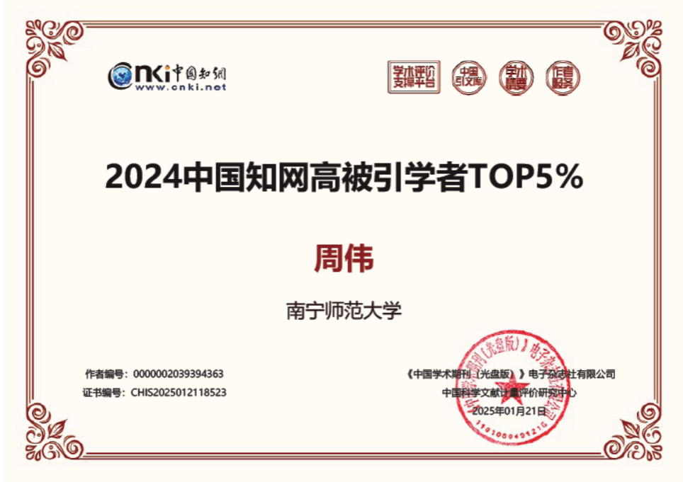 近日,中国知网下属的中国科学文献计量评价研究中心基于中国知网收录的国内学术成果,首次开展学者学术影响力客观评价,遴选了“2024中国知网高被引学者”预发布名单。公司william威廉亚洲周伟老师入选“2024中国知网高被引学者Top5%”榜单。