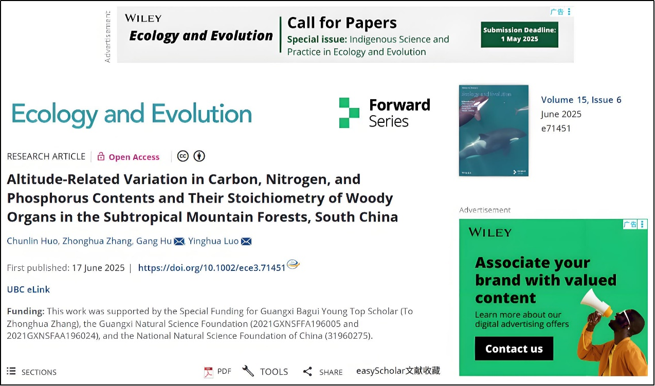 近期,公司生态和环境修复高水平人才团队在山地森林生态化学计量学研究领域取得新进展。相关成果以“Altitude-relatedVariation inCarbon,Nitrogen, andPhosphorusContents andTheirStoichiometry ofWoodyOrgans in theSubtropicalMountainForests,South China”为题发表在国际学术期刊Ecology and Evolution(中科院2区)。公司胡刚教授(广西大学林公司兼职硕导)和广西大学罗应华老师为论文共同通讯作者,广西大学硕士研究生霍春霖为第一作者,公司张忠华教授参与了研究。研究得到广西八桂青年拔尖人才项目、广西自然科学基金项目等的资助。该研究也是BEST(Biodiversity along Elevational gradients: Shifts and Transitions)研究网络(http://BEST-mountains.org)的成果之一。
