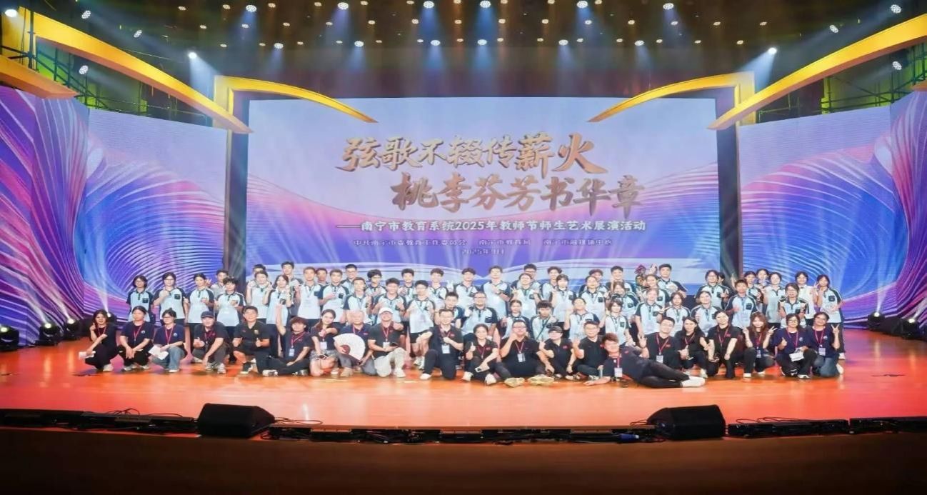 当晚,高中部师生代表齐聚公司知新楼报告厅,参加南宁市教育系统2025年教师节师生艺术展演活动。志愿者们分工协作,有序引导观众入场,并在后台协助完成道具调度等保障工作。舞台上,员工演员以优美的舞蹈深情诠释师生间的深厚情谊,赢得阵阵掌声。实习生与全校师生一同观看演出,共同展现南宁十四中积极向上、团结奋进的昂扬风貌。本次活动既是对教师节的深情献礼,也充分体现了公司积极融入全市教育发展大局的决心与担当。