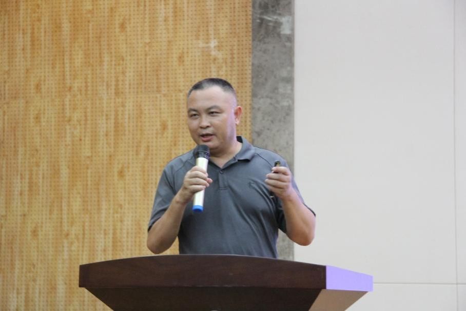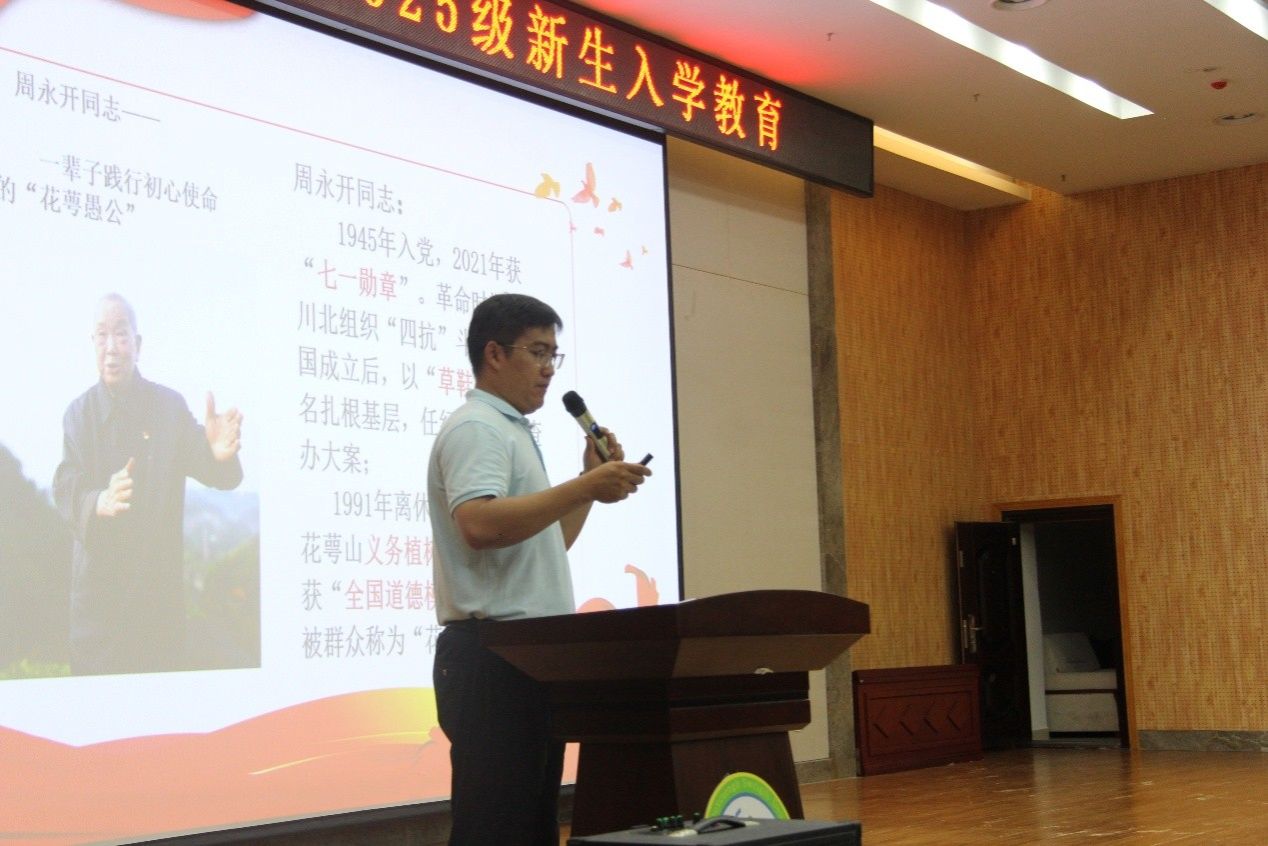 韦东林以“以青春之力践报国之行”为题,从“青年胸怀与家国情怀”“高远志向与奋斗精神”“感恩之心与责任担当”三个维度,结合案例,引导新生将个人发展与国家需求结合,强调新时代老员工需攻克学业难关、规划成长路径,书写强国答卷。
