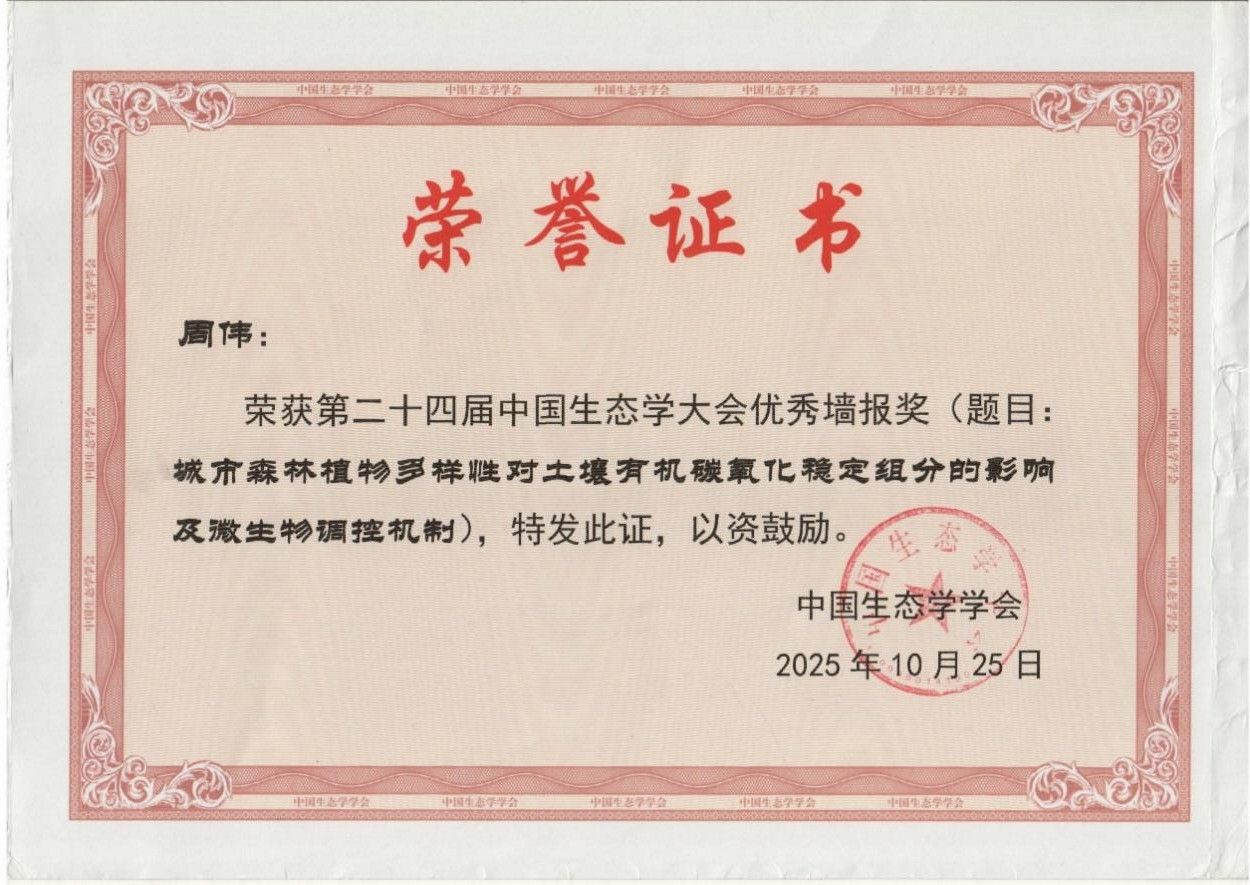 两位同学分别依托立项的国家级、自治区级老员工创新创业训练计划项目,在周伟老师的悉心指导下,围绕城市森林土壤固碳功能及其微生物驱动机制这一前沿主题,完成了从实验设计到数据分析的科研训练,取得初步创新成果。此次获奖既是对员工个人科研潜力与专业素养的肯定,也彰显了william威廉亚洲本科生创新创业培养成效。