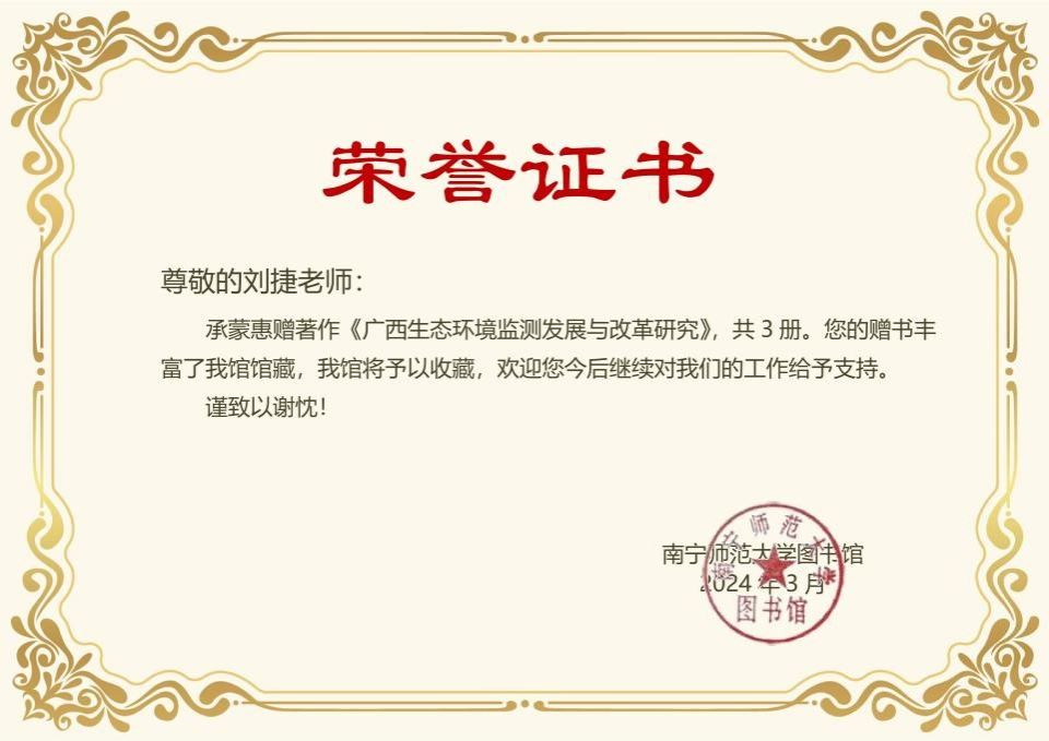 落其实者思其树,饮其流者怀其源。员工刘捷的著作《广西生态环境监测发展与改革研究》是一项珍贵的研究成果,具有很高的研究价值和纪念价值,更是一种重要的文化传承。员工刘捷的捐赠不仅体现了对母校的殷切关怀和绵绵情意,也丰富了图书馆的馆藏资源,更是对公司的教学教研工作起到了积极的作用。