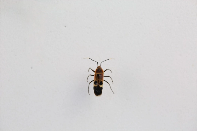 半翅目红蝽科。体长11~15mm,身体呈窄椭圆形,身上长满了半直立的浓密细毛。前翅的革质部分中央,各有一个圆形的黑色斑点;触角第4节基半部浅黄色。前足的腿节稍粗大,其腹面近端部有2或3个刺。