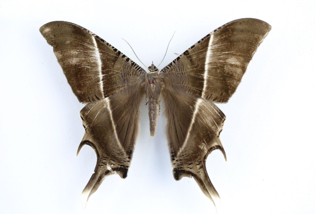 翅膀背面是淡雅的黄白色,一旦合拢却会展现出迷人的黄绿色彩,如同换上了一套“隐身衣”。它们翅膀末端那对细长的尾突,好似佩带着两把精致的“宝剑”,因此拥有了“仗剑走天涯”的潇洒美名。更有趣的是,这对“宝剑”对于绿凤蝶至关重要,一旦受损可能会影响其飞行甚至生存。分布于广东、广西、香港、越南、印度、泰国、锡金、马来西亚等。