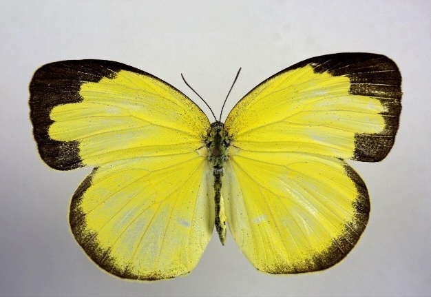 鳞翅目粉蝶科。前翅正面中室端斑为较小的白色斑,后翅正面并无清晰的红色斑块,反面中域为大片的黄色,在第5、6室中被分割为两部分,据此可与近缘的红腋斑粉蝶等种类区分开。