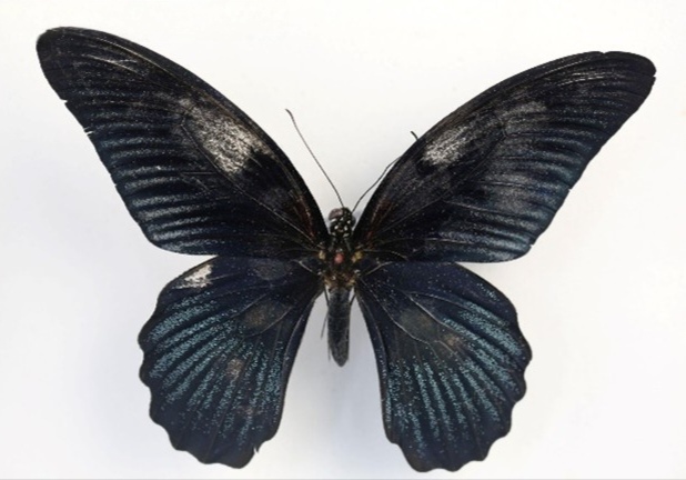 鳞翅目凤蝶科。大型风蝶,雄蝶无尾突,类似蓝凤蝶,但后翅更宽大,翅膀正面后翅的臀角没有红色斑点,前缘也没有白色区域,翅膀反面后翅的前角没有红斑,而前后翅的基部都有红色斑点。雌蝶多型,尾突可有可无,后翅宽大且中域有白斑。