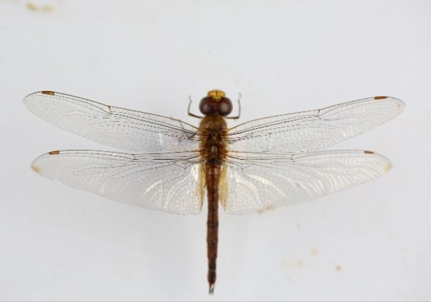 蜻蜓目蜻科。成虫腹长38mm,后翅长41mm。外形、体态略似最常见的黄蜻,但胸部是深褐色的,腹部背面是红色,末端为黑色,后翅靠近身体的基部特别宽大,还有一大块红褐色的斑块。